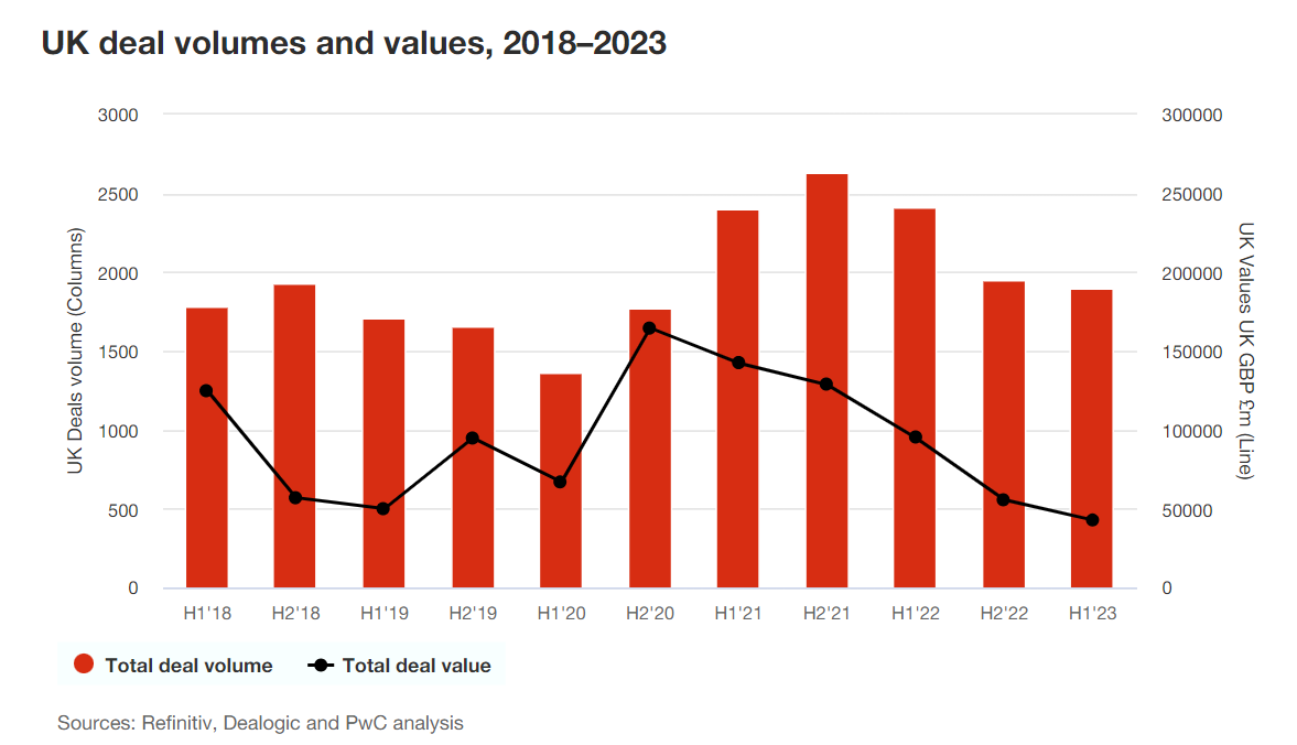 Deal values are reported by Refinitiv (LSEG) in US$. We have used an average exchange rate for H1’23 (1 GBP = 1.2338 USD) to convert US$ amounts into GBP.