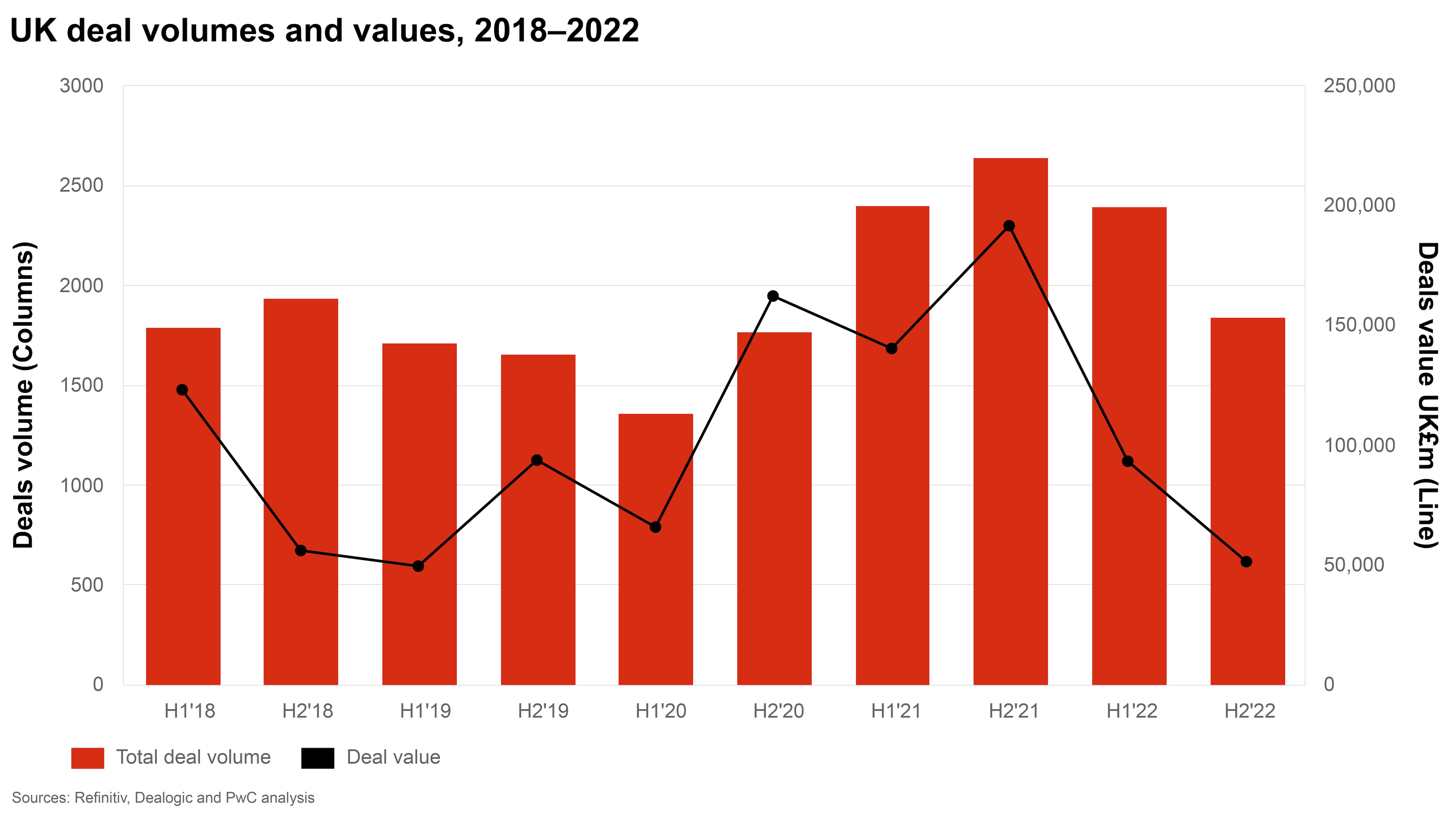 About the data: Commentary on M&A trends is based on data provided by industry-recognised sources. Specifically, values and volumes referenced in this publication are based on officially announced transactions, excluding rumoured and withdrawn transactions, as provided by Refinitiv as of 31 December 2022 and as accessed on 2 January 2023. This has been supplemented by additional information from Dealogic, Preqin, S&P Capital IQ and PwC’s independent research and analysis. The publication includes data derived from data provided under license by Dealogic. Dealogic retains and reserves all rights in such licensed data. Certain adjustments have been made to the source information to align with PwC’s industry mapping.