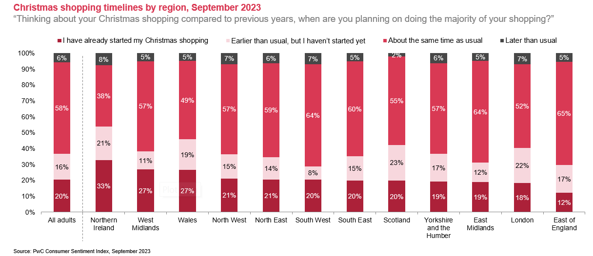 PwC released its seasonal sentiment survey results on October 16, with 20% in the South East region saying that they have already started their Christmas shopping. The majority (60%) stated they will start preparing for the festive season about the same time as usual, while 15% are aiming to start shopping earlier this year.