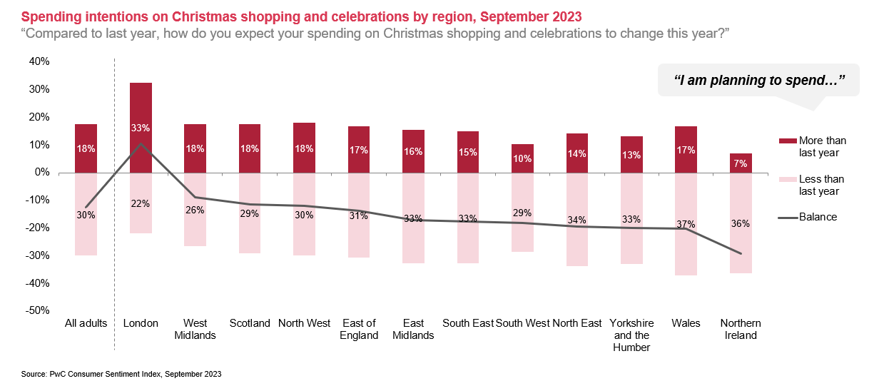 Among all the regions, only in London do 33% of consumers expect to spend more on Christmas than they did in 2022.