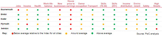 Plymouth’s strong improvement from sixth to first in the Index is due to high scores on work-life balance, income distribution and jobs. Similarly, Bristol - which rose two places to second on the Index - performs well on jobs and work-life balance, as well as skills. The South West’s cities score less well on new businesses and house price-to-earnings relative to the rest of the UK.