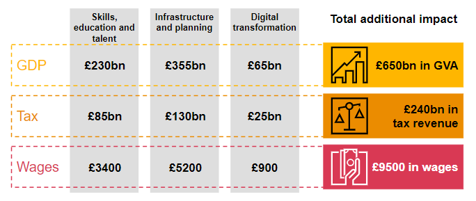 PwC has calculated a potential £650 billion uplift to UK GVA by 2035 by improving the UK’s performance across three of the biggest enablers for growth identified by business leaders - skills and education, digital transformation and infrastructure and planning - to be inline with other G7 countries. Businesses’ highest priority of skills, education and talent would see a £230 billion uplift, along with digital transformation £65 billion and infrastructure and planning a £355 billion increase.