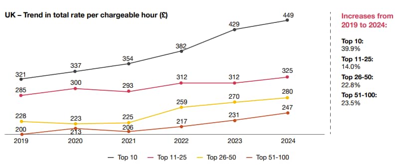UK - Trend in total rate per chargeable hour (£). Source: PwC Law Firms’ Survey 2024