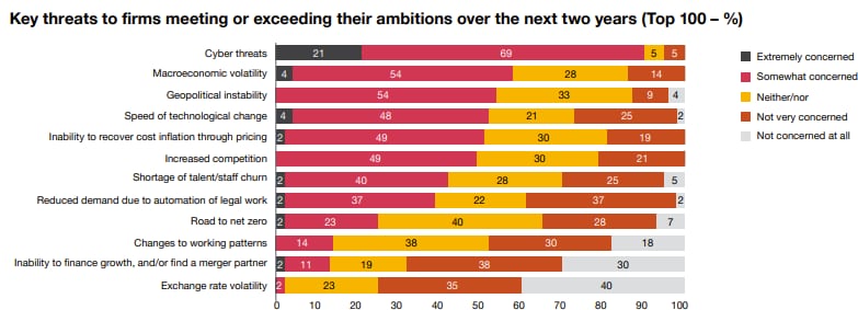 Macroeconomic volatility was the second most cited issue, despite reducing since last year (58% of the top 100 extremely or somewhat concerned vs 87% in 2023). Larger, international law firms were shown to be more concerned, linked to operating in global markets with increased exposure, whilst for UK-centric firms the economic outlook appears more positive. Concerns over geopolitical instability increased this year (54% of top 100 extremely or somewhat concerned vs 48% in 2023).