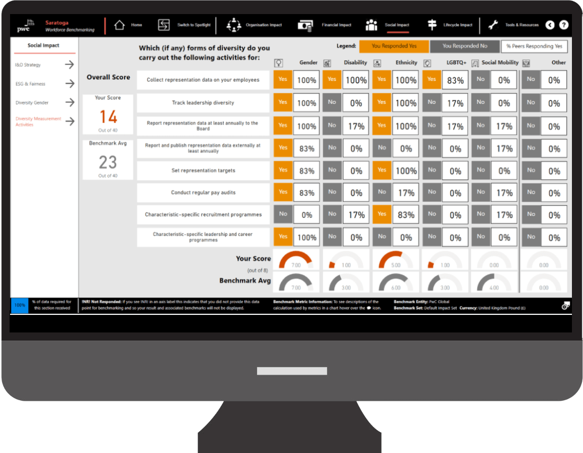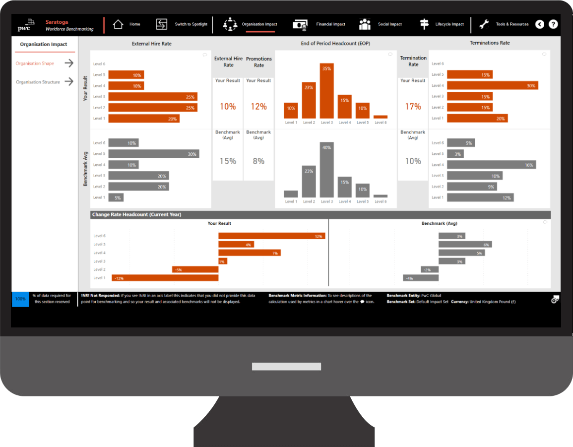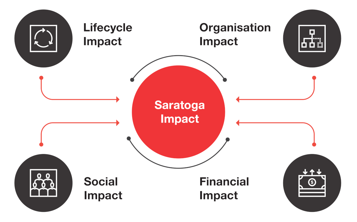 Saratoga Impact is a free for participants benchmarking offering. Provide your data aligned to the 4 areas of impact (Organisation Impact; Human Capital Impact; Social Impact; and Employee Impact) and in return receive a benchmarking report comparing your results to our global benchmarks as well as an industry peer group.