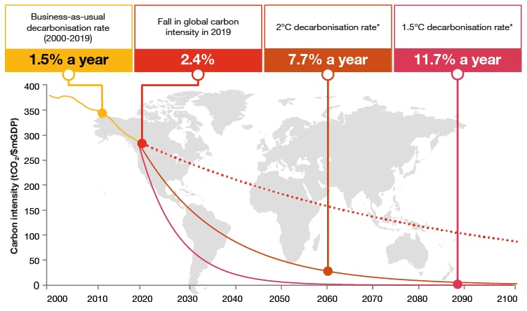 As the impacts of the COVID-19 pandemic persist globally, we cannot overlook the urgency and magnitude of the decarbonisation challenge. The 2020s are the pivotal decade for climate action. While the global response to the pandemic has brought an abrupt decrease in global emissions in 2020, the data is showing a fast rebound in emissions as economies and societies begin to open up. A return to 'business as usual' emissions post pandemic, however, is not an option if we are to achieve the emissions reductions required to limit global warming. This anomaly needs to be an inflection point that provides the opportunity for businesses and governments to reset and invest for the long-term. Achieving the necessary 11.7% per year global decarbonisation rate this decade will require wholescale transformation of every sector of the global economy, unprecedented innovation, and committed leadership.