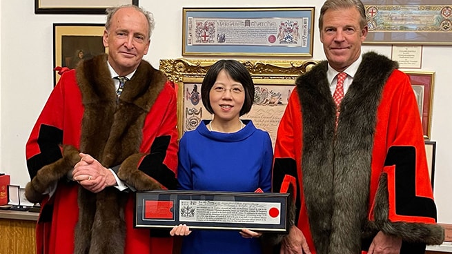Suwei Jiang, the first mainland Chinese person admitted into partnership in a Big Four UK firm was presented with the Freedom of the City at the Guildhall. Suwei was nominated by PwC’s Sir Charles Bowman and Sir William Russell, two former Lord Mayors of the City of London.